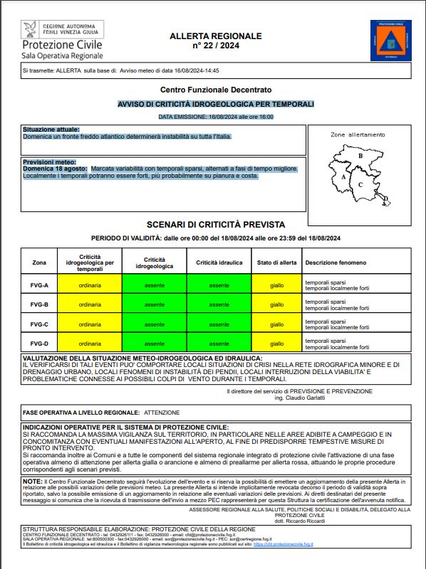 Torna l’allerta meteo gialla in Friuli per oggi sabato 17 agosto ma soprattutto domani con possibili temporali, grandinate e rovesci in diverse zone. I fenomeni potrebbero essere di forte intensità dopo giorni di caldo estremo l’energia accumulata è altissima. L’avviso di criticità idrogeologica per temporali è stato emesso ieri e prevede per domenica l’arrivo di un fronte freddo atlantico che determinerà instabilità su tutta l’Italia con repentino calo delle temperature. Le Previsioni meteo quindi prevedono: Marcata variabilità con temporali sparsi, alternati a fasi di tempo migliore.