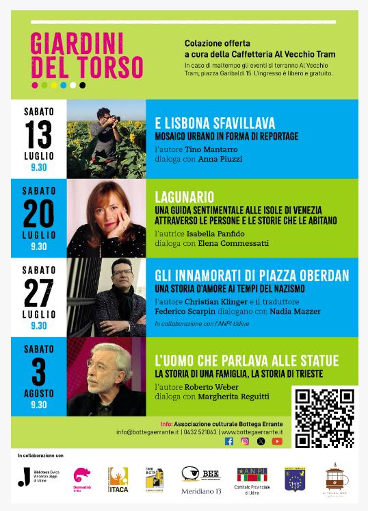 Primo appuntamento sabato 13 luglio con il giornalista del Touring Club Tino Mantarro, autore del reportage urbano “E Lisbona sfavillava”, che dialogherà su Lisbona e le sue particolarità con la giornalista Anna Piuzzi; sabato 20 luglio la scrittrice Isabella Panfido, che ci porterà tra storie e curiosità delle isole della laguna di Venezia conversando con la giornalista Elena Commessatti del libro “Lagunario”; si prosegue il 27 luglio con lo scrittore austriaco Christian Klinger, che ci farà scoprire la storia di Pino Robusti e Laura Mulli nella Trieste occupata durante la seconda guerra mondiale con il romanzo “Gli innamorati di piazza Oberdan”, con l’intervento di Nadia Mazzer dell’ANPI Udine e del traduttore Federico Scarpin; ultimo incontro sabato 3 agosto con Roberto Weber, statista e fondatore di SWG, che ci darà un altro punto di vista su Trieste e il Novecento conversando con la giornalista Margheritta Reguitti sul romanzo “L’uomo che parlava alle statue”.