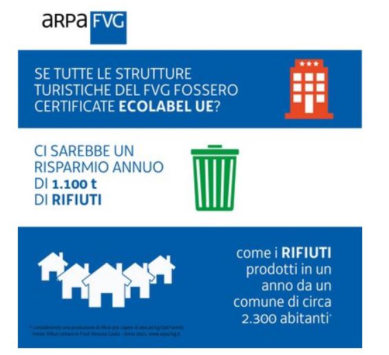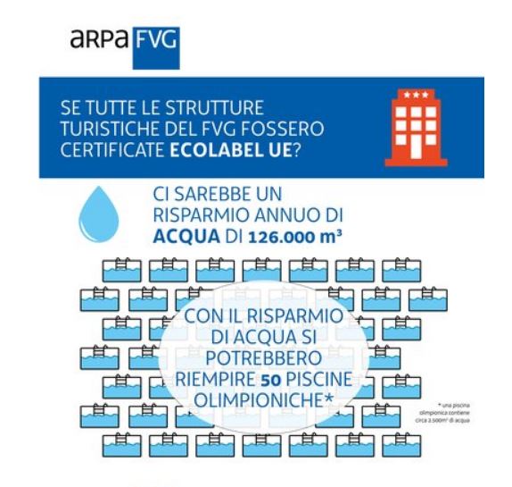 Ecolabel UE è il marchio di qualità ecologica dell’Unione Europea. Si tratta di un’ecoetichetta certificata da un ente terzo (norma di riferimento ISO 14024) che viene rilasciata solo a prodotti e servizi che superano i requisiti minimi previsti. Gli imprenditori possono richiedere la licenza d’uso del marchio Ecolabel per contraddistinguere i prodotti e servizi che sono caratterizzati da un ridotto impatto ambientale. Fra le categorie di prodotti inclusi dalla Commissione Europea possiamo citare: carta, detersivi, tessili, lubrificanti, mobili, calzature, servizi di pulizia e servizi di ricezione turistica. La certificazione Ecolabel delle strutture ricettive rappresenta una percentuale importante del totale dei prodotti Ecolabel UE in Italia. Le strutture turistiche che si fregiano del marchio ecologico europeo si distinguono per l’impegno verso la salvaguardia dell’ambiente. Arpa FVG ha condotto uno studio chiedendosi: se tutte le strutture ricettive del Friuli Venezia Giulia adottassero il marchio Ecolabel che risparmio in termini di CO2, di acqua e di produzione di rifiuti ci sarebbe? Questi i risultati: