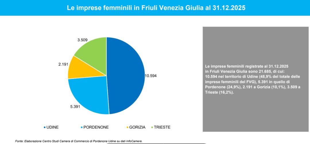 È un’istantanea che ritrae un’imprenditoria femminile in fase di consolidamento strutturale quella scattata dai dati aggiornati al 31 dicembre 2025 (e febbraio 2026 per le start-up) elaborati dal Centro Studi della Camera di Commercio Pordenone-Udine. Il rapporto, diffuso dall’ente, come di consueto, in prossimità della Festa della Donna, analizza lo stato di salute delle imprese guidate da donne e l’andamento del mercato del lavoro regionale.