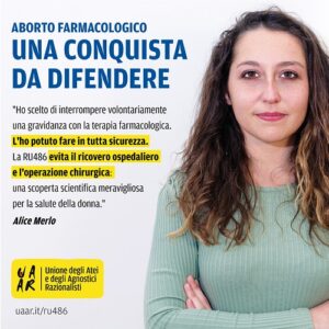 Arriva anche nella nostra regione la campagna nazionale che l’Unione degli Atei e degli Agnostici razionalisti ha promosso per difendere la possibilità e il diritto di utilizzare l’aborto farmacologico per l’interruzione volontaria di una gravidanza. Con una serie di affissioni in tutto il Friuli Venezia Giulia (Trieste, Gorizia, Monfalcone, Villesse, Udine, Latisana, Palmanova, Gemona, Tolmezzo, Cividale, Pordenone, Sacile, Maniago, Spilimbergo, San Vito al Tagliamento) , e in particolare nelle città dove sono presenti ospedali, l’Uaar vuole controbattere alle frequenti manifestazioni di paternalismo e stigmatizzazione in materia di aborto, presentato spesso come scelta per forza drammatica e sofferta. La testimonial della campagna, Alice Merlo, la giovane il cui volto è presente in manifesti e locandine, ha dichiarato «Ho scelto di interrompere volontariamente una gravidanza con la terapia farmacologica. L’ho potuto fare in tutta sicurezza. La Ru486 evita il ricovero ospedaliero e l’intervento chirurgico: una scoperta scientifica meravigliosa per la salute delle donne», denunciano successivamente che i «maggiori problemi legati all’interruzione volontaria di gravidanza sono le dinamiche colpevolizzanti, la riprovazione sociale per aver fatto quella scelta, l’imposizione del senso di colpa e del dolore». «I concetti-chiave attorno a cui ruota la nostra nuova campagna sono autodeterminazione, libertà e scienza», spiega Cinzia Visciano, responsabile nazionale dei circoli territoriali dell’associazione. «Per questo abbiamo chiesto ad Alice di esserne il volto: perché il suo sguardo e le parole da lei scelte per raccontare la propria esperienza di aborto medico testimoniano proprio tutto ciò: la capacità di ogni donna di scegliere per se stessa, l’irrinunciabilità di decidere del proprio corpo e della propria vita, l’importanza della ricerca scientifica in materia di salute sessuale e riproduttiva». «Anche in Friuli Venezia Giulia, diverse prese di posizione di esponenti politici locali, referenti di componenti clericali della società, ci indicano che il diritto all’aborto sicuro è sotto attacco. Con questa campagna vogliamo riaffermare con forza il diritto di tutte le donne ad un aborto libero, gratuito e sicuro» dichiara Luciano Bellomo, coordinatore dei circoli Uaar della regione.