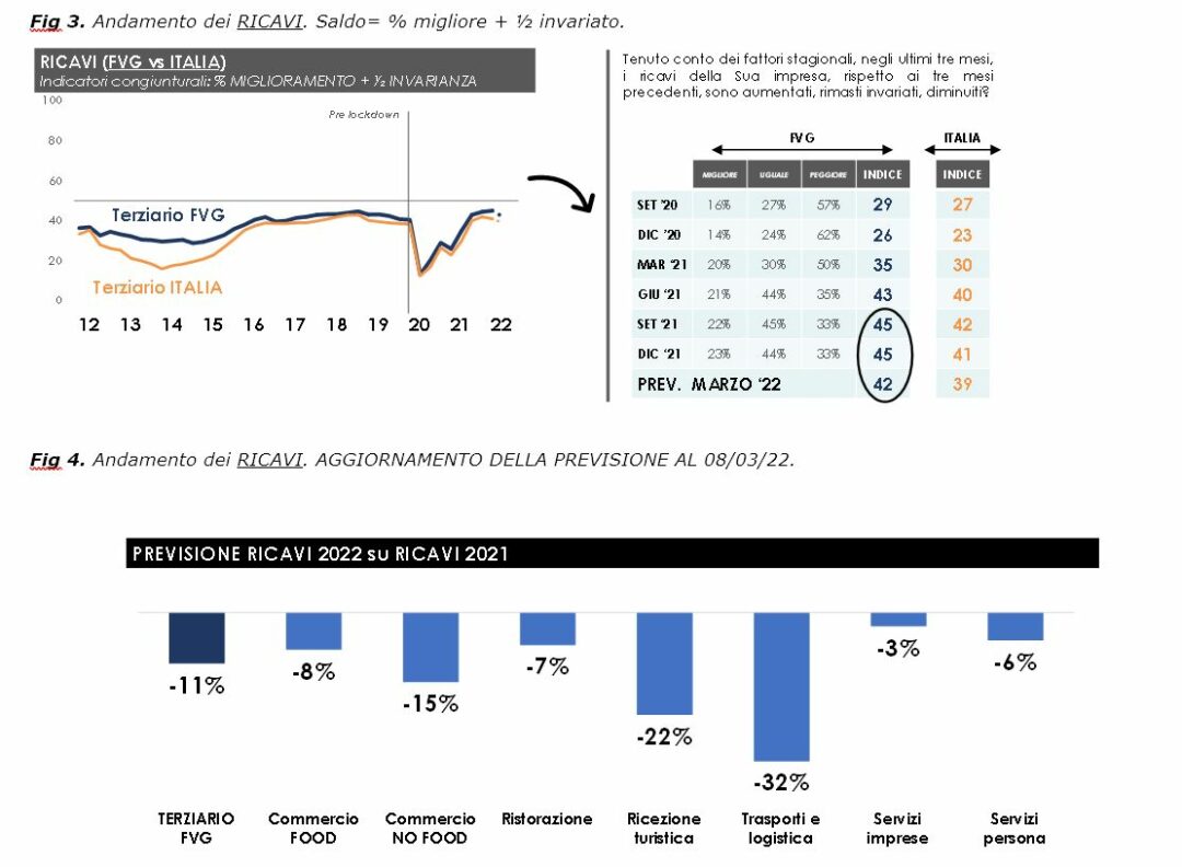 Nell’ultima parte del 2021 avevano “tenuto” i ricavi delle imprese del terziario del Fvg. Tuttavia, la previsione per i primi mesi del 2022 già evidenziava un rallentamento dell’indicatore congiunturale (che scendeva da quota 45 a 42). Il commercio non-alimentare risultava tra i comparti più in difficoltà, anche a causa di una stagione invernale dei saldi al di sotto delle aspettative. A causa dello scoppio del conflitto, le imprese del terziario del Fvg si aspettano una possibile riduzione del -11% dei ricavi a seguito dell’impatto della nuova crisi. Gli operatori dei trasporti e della logistica sono coloro che temono le conseguenze più forti.