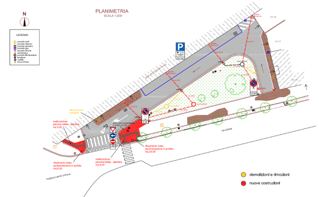 I lavori in corso, che si concluderanno entro la fine di agosto 2023, hanno previsto inoltre l’esecuzione di nuovi impluvi per il deflusso delle acque piovane e la creazione di un percorso tattilo-plantare per facilitare il passaggio alle persone cieche e ipovedenti. Quest’ultimo intervento, in particolare, è una prassi nella revisione delle aree urbane calpestabili, che prevede in tal senso l’abbattimento delle barriere architettoniche.